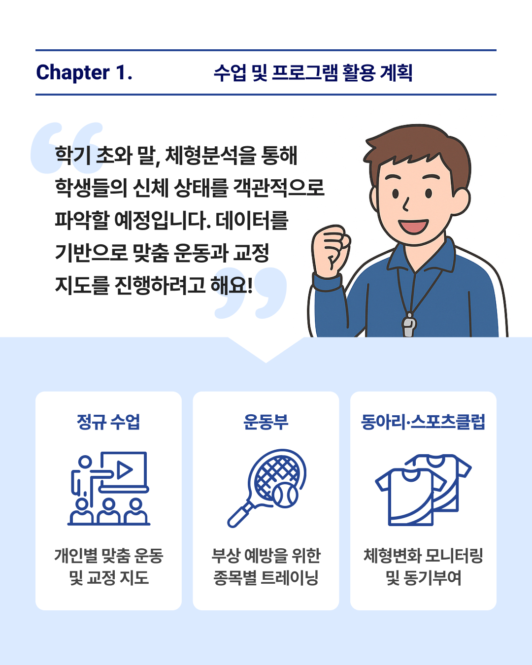 정규 체육 수업에서는 학기 초와 학기 말에 체형분석을 실시하여 학생들이 자신의 신체 상태를 객관적으로 파악하고, 이를 바탕으로 개인별 맞춤 운동 계획을 세울 수 있도록 할 예정입니다. 특히 체형 교정이 필요한 학생들에게는 구체적인 개선 방향을 제시해 보다 효과적인 수업 운영이 가능할 것으로 기대합니다.