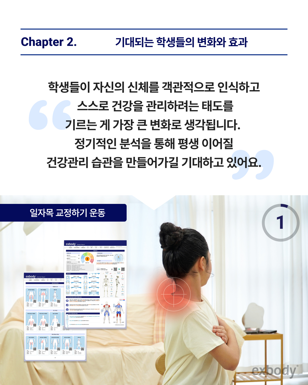 엑스바디를 통해 학생들에게 기대하는 가장 큰 변화는 자신의 신체를 객관적으로 인식하고, 건강 관리에 능동적인 태도를 기르는 것입니다. 학생들은 체형 데이터를 통해 막연하게만 느꼈던 신체적 문제점을 구체적으로 확인할 수 있으며, 특히 장시간 앉아 생활하면서 발생하는 체형 불균형이나 자세 문제를 시각적으로 인지하게 됩니다. 이를 통해 건강한 생활 습관의 필요성을 스스로 느끼고 실천하려는 동기가 생길 것으로 기대합니다.