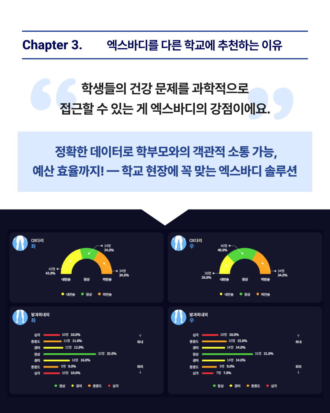 동료 선생님들께 엑스바디를 추천하고 싶은 가장 큰 이유는 학생들의 건강 문제를 구체적이고 과학적으로 접근할 수 있다는 점입니다. 최근 학생들의 체형 불균형과 체력 저하 문제가 심각해지고 있지만, 기존에는 육안 관찰이나 주관적인 판단에 의존할 수밖에 없었습니다. 엑스바디를 활용하면 정확한 데이터를 바탕으로 학생 개개인의 문제점을 명확히 파악할 수 있으며, 학부모님께도 객관적인 자료로 설명할 수 있어 매우 유용합니다.